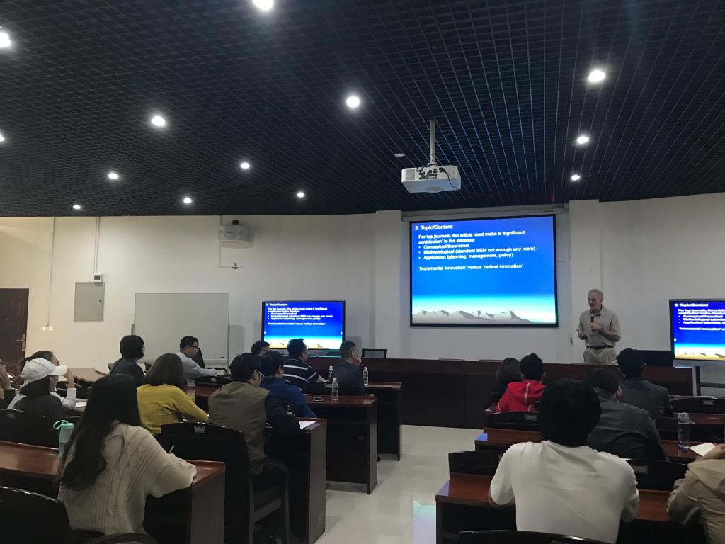 David Weaver教授围绕“如何在高端刊物发表文章”这个主题以严谨、专业、细致的学者风格为在座的老师和员工详尽地进行了讲解。讲解的内容以国际论文写作要求分为了8个部分:(1)Publishing Context;(2)Publication outlet selection;(2)Topic/content;(3)Manuscript structure;(4)Dancing with the journal;(6)Before submitting;(7)General principles of submission;(8)Responding to feedback。在David Weaver教授讲座后,bevictor伟德旅游公司宋子斌教授进行了总结点评并引导在座师生与David Weaver教授互动交流。在互动交流的环节中,老师与同学都积极向David Weaver教授请教问题,David Weaver教授对所有问题都进行了耐心、睿智、有趣的解答。