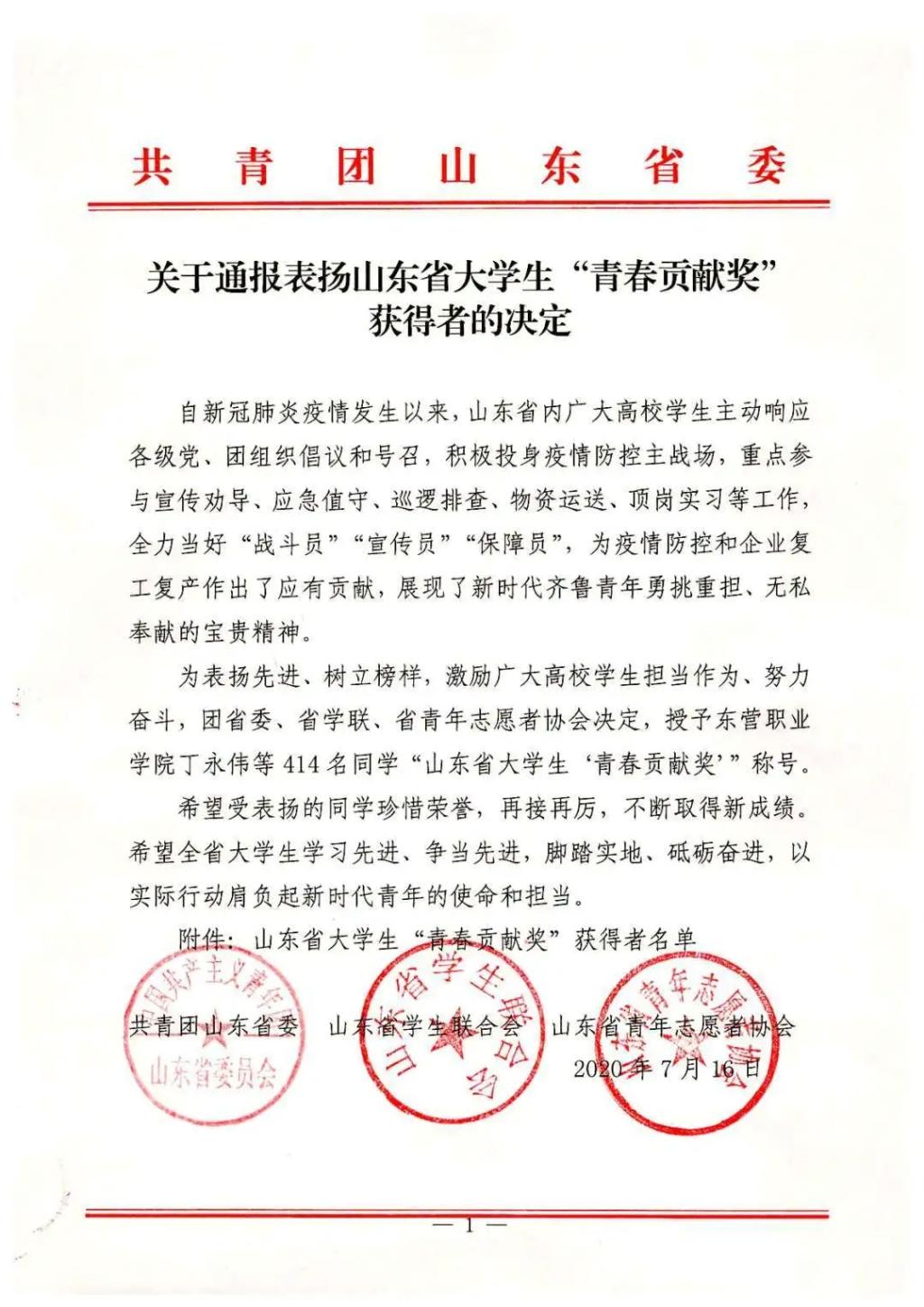 2017级酒店管理3班员工党员韦媛勋在疫情期间主动报名担任志愿者,积极协助当地社区防疫抗疫,以实际行动彰显公司学子风采,践行新时代青年的使命与担当,荣获山东省老员工“青春贡献奖”。