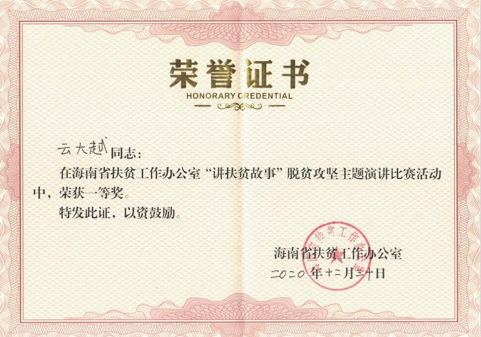 【喜报】公司云大越同志在海南省扶贫工作办公室“讲扶贫故事”脱贫攻坚主题演讲比赛活动中荣获一等奖