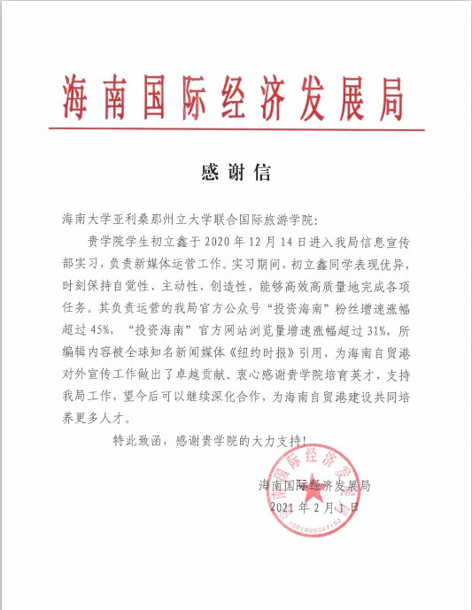 近期,海南国际经济发展局向伟德体育发来感谢信,对公司2017级实习生初立鑫同学在工作中的优秀表现予以特别表扬。初立鑫同学于2020年12月开始在海南国际经济发展局信息宣传处实习,主要负责新媒体运营工作,在他的努力下,由他主责运营的“投资海南”公众号粉丝增幅超45%,“投资海南”官方网站浏览量增幅超31%,所编辑内容被世界著名媒体《纽约时报》引用,为海南自贸港对外宣传工作做出卓越贡献。