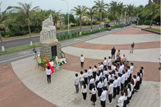 在庄严的烈士纪念碑前,何映敏同志组织全体师生面向渡海作战纪念碑三鞠躬,并敬献花篮,向革命烈士默哀致敬,追忆革命先烈的不朽功勋,表达对革命先烈的深切缅怀之情。