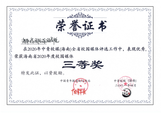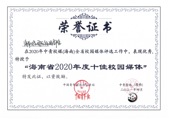 2021年4月,为传递校媒精神,共谋琼媒发展,由中国青年报社海南记者站指导、中青校媒(海南)主办的“海南省2020-2021年度优秀校园媒体评选”正式展开。本次年度优秀校园媒体评选共分为网络人气票选、申报材料评分、现场演说答辩三个方面,共有22个优秀校园媒体参与评选。在本次参选的众多参评媒体中,bevictor伟德伟德体育脱颖而出,被授予“海南省2020年度十佳校园媒体”称号,并荣获“海南省2020年度校园媒体三等奖”!