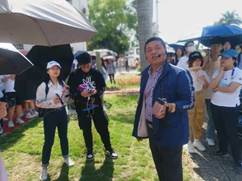 “港北渔村”创始人——乡贤莫泽锦向同学们介绍港北渔村
