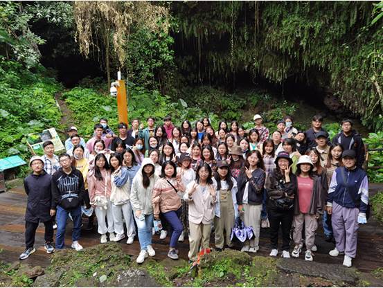 部分师生在风炉岭火山口底部的合影