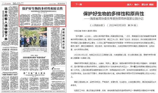 2月18日,《人民政协报》第4版报道了海南省政协委员考察热带雨林国家公园活动,公司经理王琳教授参加。