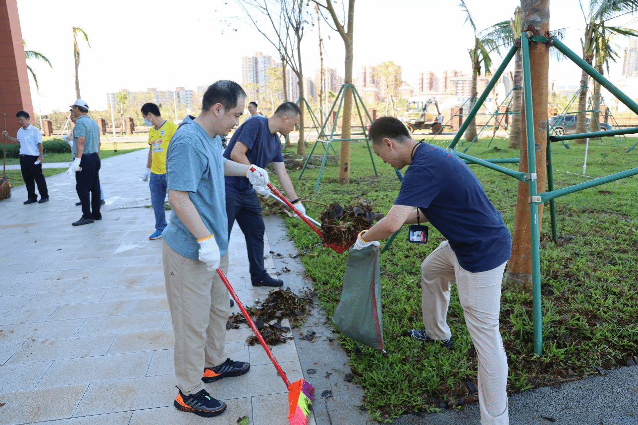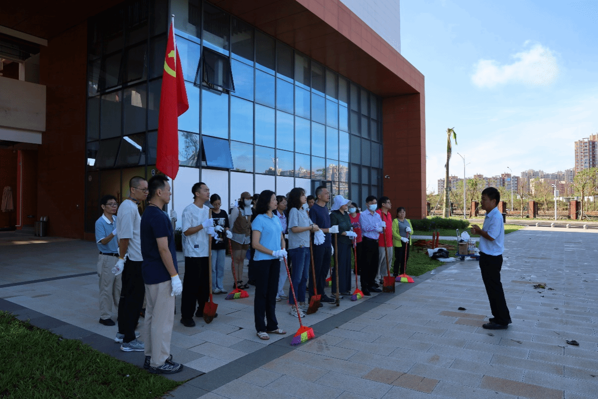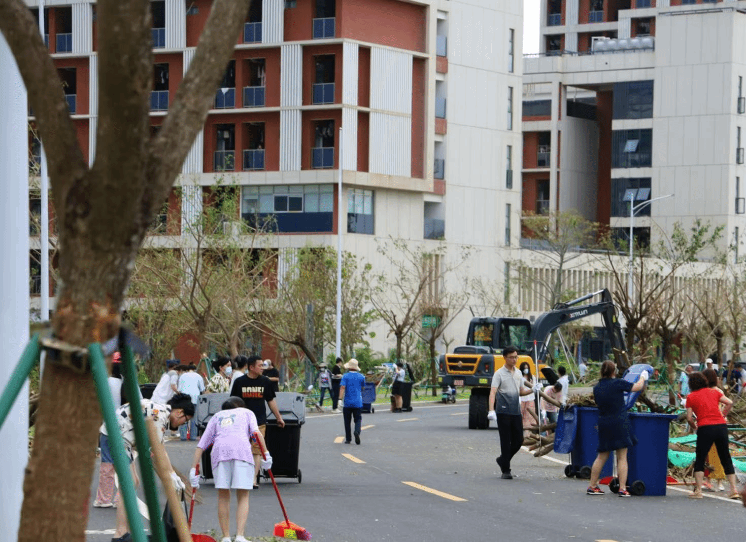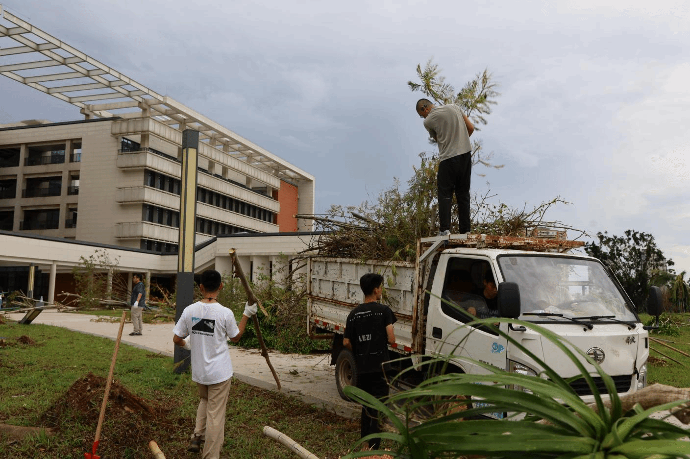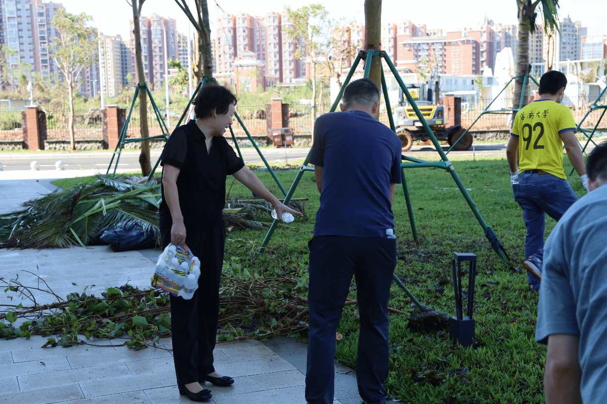 超强台风过后,校园内树木倒伏,杂物散落,一片狼藉。公司党员教师和行政干部主动请缨,卷起袖管,清理落叶和路障,扶起倒塌树木残枝。在大家的齐心协力下,各主干道已经基本通畅。